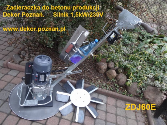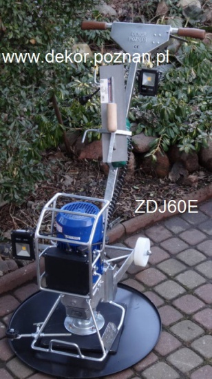 Zacieraczka elektryczna do wygładzania posadzek z półsuchego betonu. Profesjonalna, przeznaczona do pracy w trudnych warunkach. Wzór zastrzeżony. Producent: Dekor PUHB, Poznań. Silnik 1,5kW/230V. 130 obr/min. Silny walcowy reduktor włoski. Lampa LED, lampki kontrolne, wydłużana i całkowicie odejmowana rączka z dużą regulacją. Całość cynkowana.