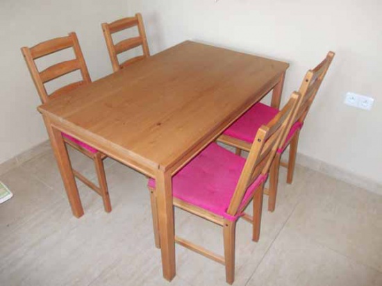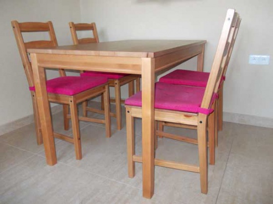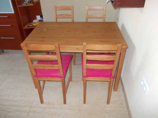 Stolarz sprzeda nowy nieużywany komplet stół + 4 krzesła - sosnowe. Widoczne zdjęcia pochodzą z własnej kuchni. Wymiary: wys 75 cm | szer. 70 cm | dł. 120 cm. Stół solidnie wykonany, zabezpieczony lakierem, z widoczną strukturą usłojenia Cena: 750 zł + koszt wysyłki ( ewentualnie dowiozę na miejsce ) Krzesła sprzedaje bez widocznych czerwonych podkładek. Gorąco polecam.