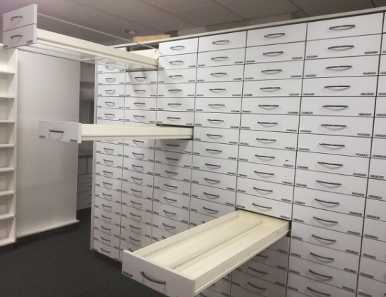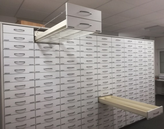 W pionie jest około 19 szuflad na łożyskach, szuflada wyposażona jest w przegrody i boczne opisy.