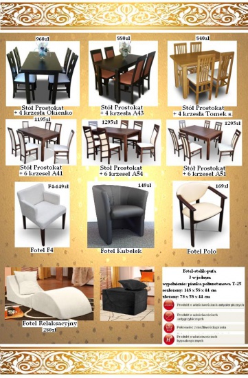 Produkty wykonane są ze sprawdzonych materiałów, używanych we firmie od lat. Z połączenia solidnych drewnianych stelaży, wytrzymałych metalowych części oraz dobrych gatunkowo materiałów obiciowych powstaje solidna, estetyczna całość.