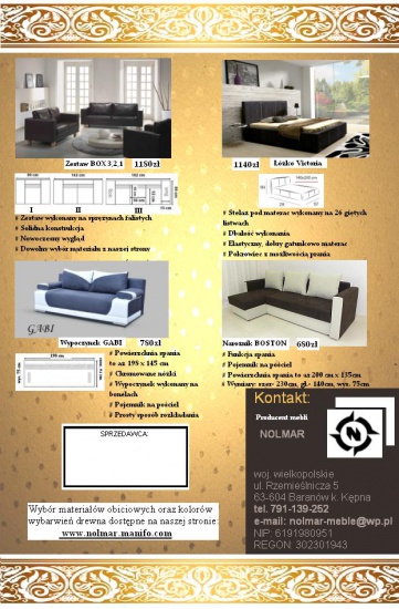 Firma Nolmar powstała po połączeniu doświadczenia z trzech pokoleń, które działają w branży meblowej od lat. Dla uzyskania konkurencyjnych cen firma ta zaopatruje się w materiały tylko u najlepszych producentów. Ulokowanie w południowej części wielkopolski, w zagłębiu meblowym, pozwala na byciu na bieżąco z nowinkami oraz wymaganiami europejskimi co do jakości wykonywanych produktów. Największym celem firmy jest zadowolenie klienta pod względem szybkości realizacji zamówienia, jakości oraz atrakcyjności cen dla pozyskania stałych odbiorców na lata.