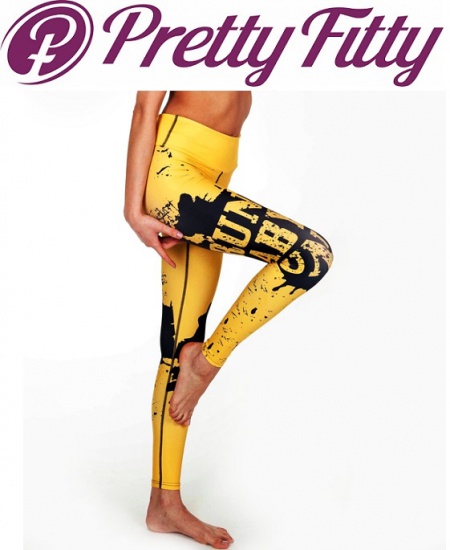 DETAL: wzór żółto czarne, na prawej nogawce napis RUN BABY RUN