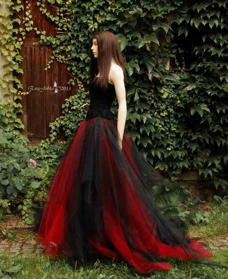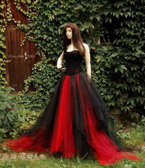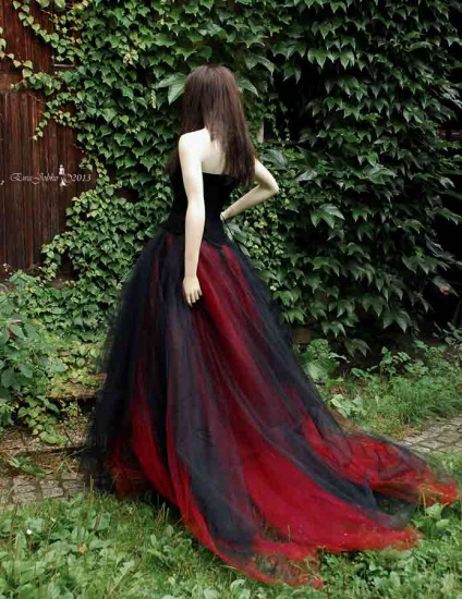 w kolorze od czerwieni po bordo do czerni. z długim trenem.