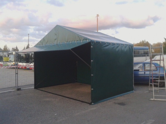 Nasza firma zajmuję się produkcją namiotów handlowych oraz magazynowych. Namiot taki wykonany jest ze stali (profil zamknięty 30x30x2 )oraz mocnej plandeki stosowanej przy produkcji plandek na naczepy tir gramatura 680gr/m2. Namioty tego typu są bardzo stabilne jak i wytrzymałe na warunki atmosferyczne.Kolor do wyboru przez klienta. Konstrukcja namiotu jest wykonana tak by namiot można było przewieść np. przyczepką montaż takiej konstrukcji trwa ok 20 minut. Przykładowe ceny namiotów