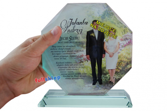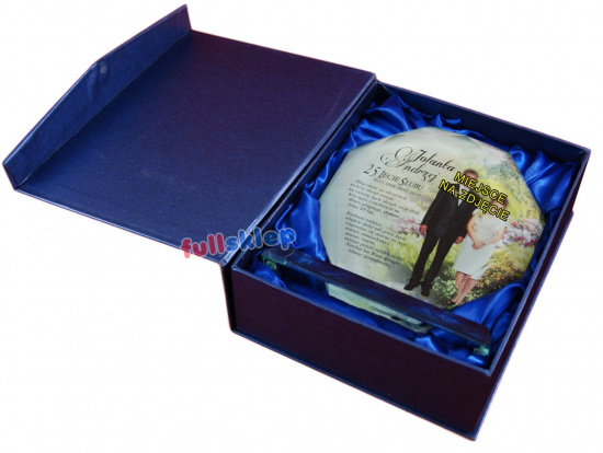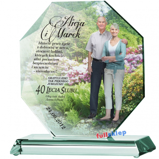 Ten podarunek będzie zachwycającą pamiątką Jubileuszu Małżeństwa na długie lata. Statuetka szklana na której możesz umieścić fotografię czarno białą lub w kolorze osób obchodzących jubileusz małżeństwa i swój wyjątkowy tekst życzeń.