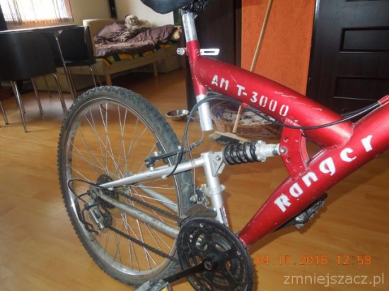 Sprzedam rower Ranger T 3000, 100% sprawny, posiada 26 " koła, z przodu i z tyłu amortyzatory, przedni hamulec tarczowy.