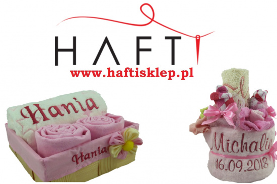 Firma HAFTI posiada szeroki wybór produktów stanowiących elementy wyprawki niemowlęcej doskonałej jakości, w modnych kolorach oraz niezwykle użytecznych w pierwszych miesiącach życia dziecka. Wyprawkę dla niemowlęcia możemy skomponować z dowolnie wybranych produktów z oferty sklepu internetowego HAFTI. Wszystkie elementy wyprawki niemowlęcej mogą być ozdobione haftem ze wspólnym motywem lub posiadać różne napisy, wzory czy kolory. Na specjalne okazje związane z narodzinami dziecka firma HAFTI przygotowuje torty niemowlęce z dowolnie wybranych artykułów z oferty artykułów dziecięcych dostępnych w sklepie www.haftisklep.pl. W sklepie internetowym HAFTI umożliwiamy zakup oryginalnie ozdobionych haftem produktów, z których pomożemy Klientowi skomponować niepowtarzalny zestaw prezentowy dla dziecka. Oferta produktów, z których możemy skomponować zestaw prezentowy obejmuje kocyki z misiem z wyhaftowanym dowolnym tekstem, imieniem dziecka lub sentencją, body niemowlęce z haftem, śliniaczki ozdobione haftem, metryczki z wyhaftowanymi danymi urodzeniowymi dziecka, pluszowe misie z imieniem dziecka lub dowolnie wybranym tekstem. Haft komputerowy jest trwałym i bezpiecznym sposobem na stworzenie personalizowanych produktów dla dzieci. Haft wykonywany jest przy użyciu nici hafciarskich, które nie są barwione toksycznymi barwnikami, wykonany haft nie odbarwia się w trakcie prania oraz nie niszczy się w trakcie użytkowania, a więc nie ma ryzyka odklejenia się czy łuszczenia jak w przypadku naklejek czy naprasowanek. Wszystkie produkty dla dzieci w ofercie sklepu internetowego HAFTI pochodzą od zaufanych producentów, posiadają stosowne certyfikaty dopuszczające produkt do używania przez dzieci oraz zostały dopuszczone do obrotu przez odpowiednie instytucje.