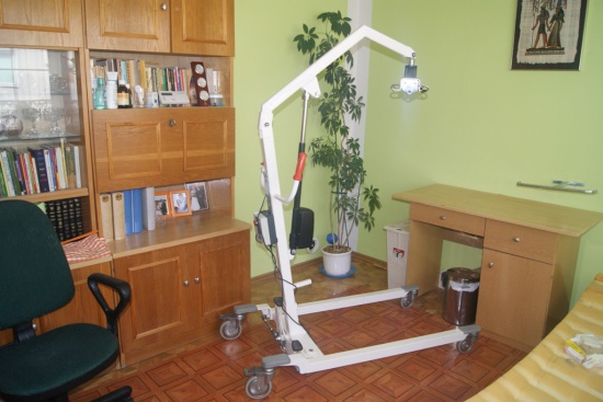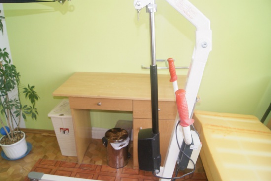 Posiadam do sprzedania używany podnośnik ułatwiający opiekę nad osobą leżącą, nie mogącą samodzielnie wstawać i poruszać się. Specjalna płachta mocowana do wysięgnika umożliwia podniesienie niepełnosprawnego w pozycji leżącej, przetransportowanie do innego pomieszczenia np. wanny w celu wykąpania. Urządzenie posiada zasilanie akumulatorowe umożliwiające podnoszenie i opuszczanie osoby o wadze do 135 kg . Sterowanie pilotem połączonym kablowo. Urządzenie sprawne i kompletne. Cena 1000,00 zł. Odbiór osobisty lub możliwość przywiezienia podnośnika do kupującego