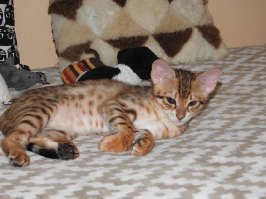 Cute savannah F3c male cat was born 21st July 2017. Parents are very good in character, tested by blood for hereditary and fatal cats - negative. The male is registered in TICA USA and has a pedigree. He is vaccinated, dewormed, has a pet passport and a chip. Heis very playful and affectionate. He will be ready at the beginning of November for the new home. Only for serious interest. Price by agreement.