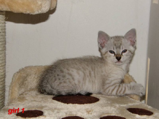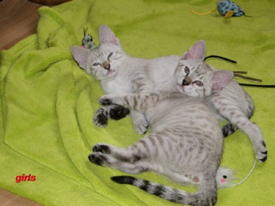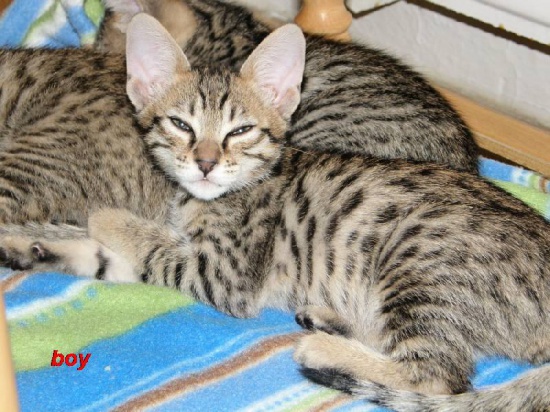 I offer 3 kittens savannah F7 SBT: 2 girls and 1 boy, were born 3.1.2015. Both parents are with good character, have a pedigree with registration in Tica, blood tests for the deadly disease, PK deficit negative. 2 girls are colored in bright marble dotted, a boy is in brown, black, tabby, dotted. Kittens are pets, playful, talkative and very active. Our kittens are dewormed and vaccinated. They will be ready for new homes at the beginning of April 2015. The price for kitty: on request.