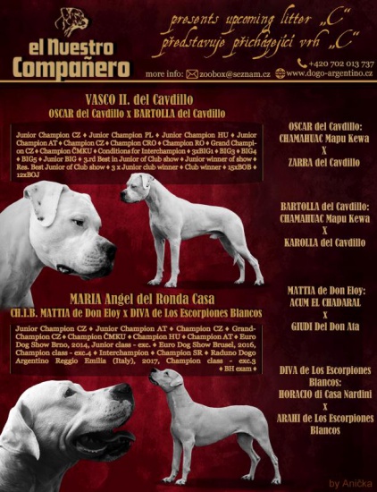 Breeding station sells Dogo Argentino puppies with pedigree from an excellent mating: father - multi JCH, multi CH VASCO II del Cavdilo (Slovakia), mother - multi JCH, multi CH, ICH MARIA Angel del Ronda Casa (import Belgium). For more informations please visit our website www.dogo-argentino.cz, e-mail: (skorzystaj z formularza).