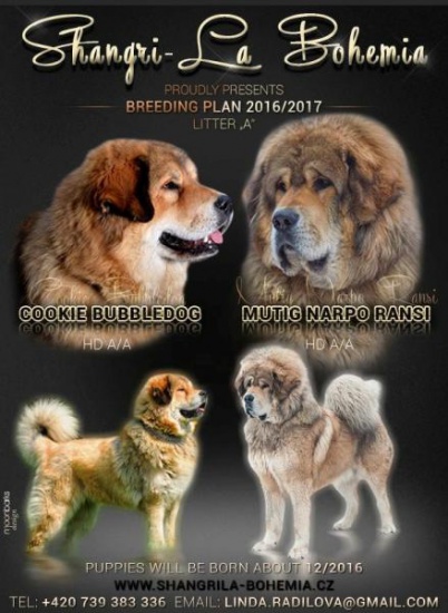 Breeding station Shangri-La Bohemia offers for sale a golden male puppy - the first born - hairiest of all litter and beautiful golden greatest female puppy. Parents Cookie Bubbledog x Mutig Narpo Ransi They have strong bones and balanced character. Both are successful on shows, parents have HD 0/0. Father of puppies measured 82 cm !!! Puppies will be ready for new homes in the end of March. Puppies will be chipped, vaccinated, with the purchase agreement and passport. Price for puppy: 800 EUR. More at www.shangrila-bohemia.cz