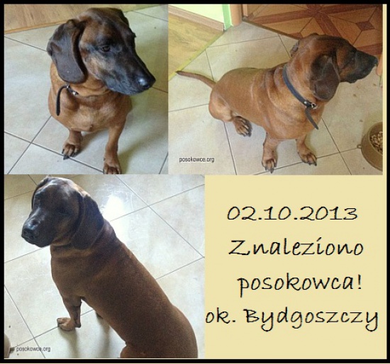 W dniu 2.10.2013r w lesie w okolicach Łęgnowa koło Bydgoszczy na trasie z Solca Kujawskiego do Bydgoszczy znalazłam Posokowca. Jest to pies około 5-letni. Pies miał na sobie obrożę.