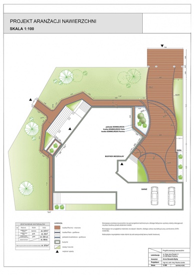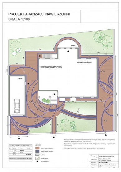 - Projekt zawiera szczegóły techniczne: układy kostki, ilości zastosowanych rzędów, kierunki ułożenia kostki, szczegółowe rozmieszczenie płyt tarasowych, itp.