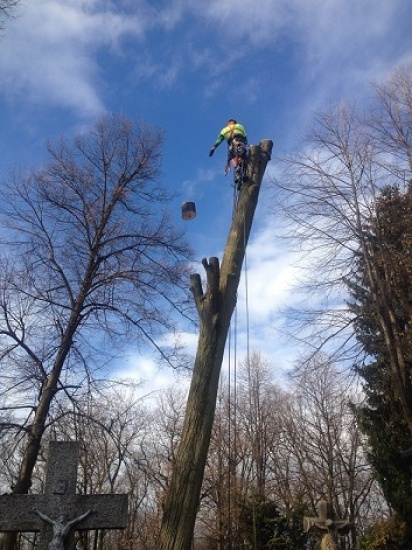 Wycinka drzew na terenie cmentarza stanowi duży problem. Do jej przeprowadzenie niezbędna jest firma dysponująca ogromnym doświadczeniem i profesjonalnym sprzętem. Ze względu na ekstremalne warunki, przy usuwaniu drzewa na cmentarzu stosuje się wycinkę sekcyjną, polegającą na kontrolowanym opuszczaniu gałęzi i konarów, potem pnia na specjalnie do tego przeznaczonych linach i zbloczach.