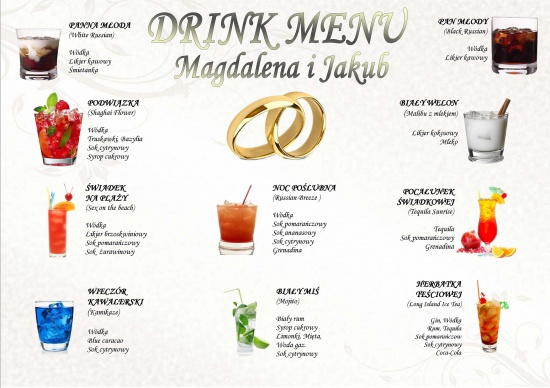 Kartę drinków ustalam wspólnie z Państwem, dostosowując ją do konkretnego wydarzenia i możliwości finansowych. Pomagam w doborze alkoholi i drinków. Posiadam także własne gotowe propozycje kart.