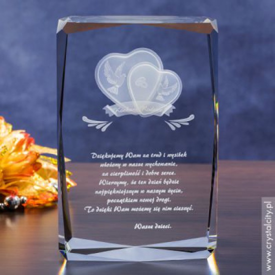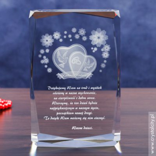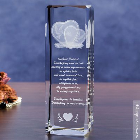 Planujesz ślub? Już teraz pomyśl o prezencie dla rodziców, którą może być ta wspaniała statuetka ze szkła grawerowanego Serca 3D. Dzień zaślubin to wyjątkowy dzień dla dwojga ludzi wkraczających na wspólną drogę życia. Dzień, w którym nadarza się niepowtarzalna okazja by w wyjątkowy sposób uczcić obecność rodziców. Podziękowania rodzicom to jedna z ważniejszych chwil podczas uroczystości weselnej.