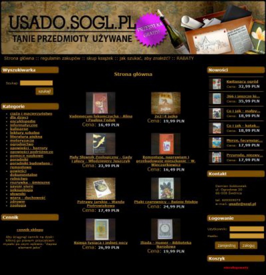 Dlaczego sprzedawcy coraz chętniej decydują się na zakup sklepu internetowego? Prawdopodobnie chodzi o obniżenie kosztów pracy (sklep internetowy zastępuje lokal i sprzedawcę), nieograniczony zasięg (bo internet to sieć światowa), wygodę obsługi (sklep internetowy przejmuje na siebie większość czynności) oraz chęć dotarcia do niedostępnego dotąd grona klientów! Oferuję dla Państwa usługę wykonania sklepu w cenie 2500zł netto. Jest to cena za kompletny sklep, gotowy do działania, bez jakichkolwiek ukrytych kosztów. Mam także tańszą wersję za 400 PLN netto dla osób, które nie mogą sobie pozwolić na droższą wersję. Tel kom. +48605305075 , stacjonarny: +48223008232, e-mail: (skorzystaj z formularza) , www.windux.pl