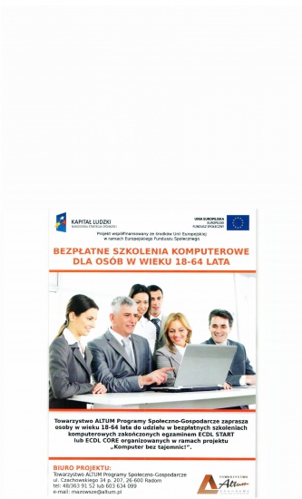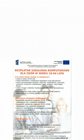 Towarzystwo ALTUM Programy Społeczno-Gospodarcze zaprasza osoby w wieku 18-64 lata do udziału w bezpłatnych szkoleniach komputerowych zakończonych egzaminem ECDL START lub ECDL CORE organizowanych w ramach projektu „Komputer bez tajemnic!”