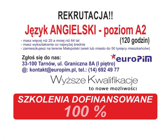 Jeśli na powyższe pytania odpowiedziałaś/eś twierdząco, zapisz się na dofinansowany w 100% kurs języka angielskiego i zdobądź certyfikat TELC w ramach projektu „Wyższe kwalifikacje to nowe możliwości”. Priorytetu IX „Rozwój wykształcenia i kompetencji w regionach”, Działanie 9.6 „Upowszechnienie uczenia się dorosłych”, Poddziałanie 9.6.2 „Podwyższanie kompetencji osób dorosłych w zakresie ICT i znajomości języków obcych”, Programu Operacyjnego Kapitał Ludzki 2007-2013