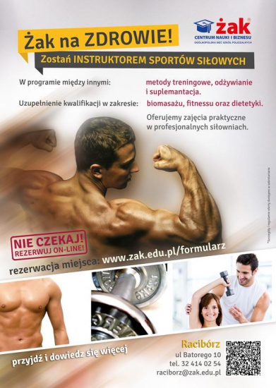 Zapraszamy do szkoły ŻAK! Oferujemy dużą liczbę godzin zajęć praktycznych! Zajęcia odbywają się w profesjonalnie wyposażonej siłowni! Do zapisu wystarczy świadectwo ukończenia szkoły średniej, nie wymagamy matury!