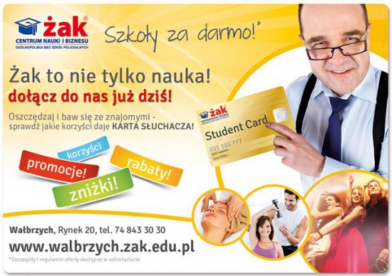 Zapisz się do Szkoły Żak i korzystaj ze zniżek u naszych partnerów handlowych w całej Polsce dzięki Karcie VIS! Przyjdź do Sekretariatu Szkoły (Wałbrzych, Rynek 20, tel. 74 8433030) lub zapisz się przez Internet: