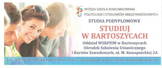 Ośrodek Szkolenia Ustawicznego i Kursów Zawodowych w Bartoszycach jako partner Instytutu Studiów Podyplomowych Wyższej Szkoły Komunikowania, Politologii i Stosunków Międzynarodowych w Warszawie przedstawia ofertę studiów podyplomowych.