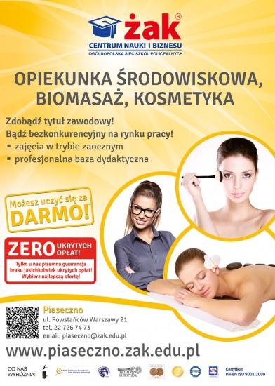 Tylko Szkoła Centrum Nauki i Biznesu ZAK w Piasecznie da Ci możliwość zupełnie ZA DARMO nabyć wiedzę oraz praktykę tego zawodu. Nauka trwa tylko 2 lata a zajęcia odbywają się w systemie zaocznym.(Sobota i Niedziela), co 2-3 tygodnie. Spokojnie można pogodzić to z codziennym życiem. Nie czekaj zarezerwuj sobie miejsce już teraz: www.zak.edu.pl/formularz