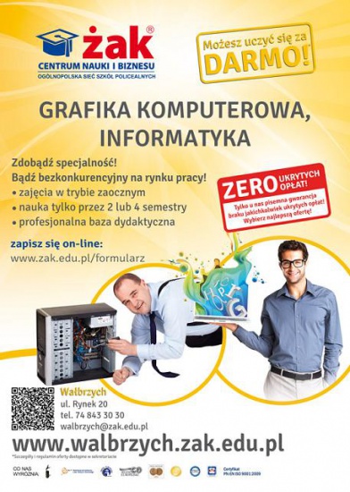 Marzysz o dodatkowych umiejętnościach graficznych? Chcesz zdobyć nową specjalizację jako informatyk? A może chciałbyś pracować w marketingu przy tworzeniu reklam? Grafika komputerowa to idealny kierunek dla Ciebie! Nowe kwalifikacje można zdobyć w jedyne 10 miesięcy! Dowiedz się więcej na www.zak.edu.pl lub przyjdź bezpośrednio do sekretariatu szkoły: Wałbrzych, Rynek 20, Tel. 74 843 30 30.
