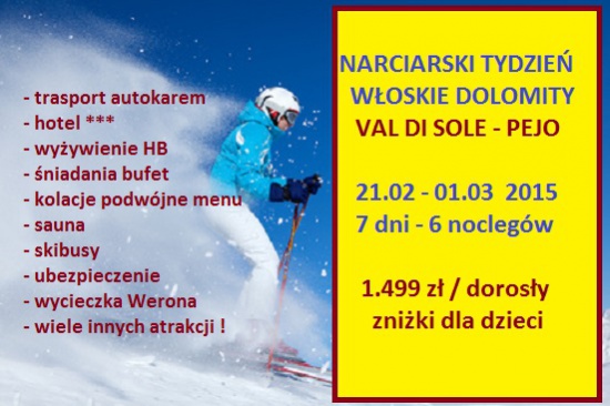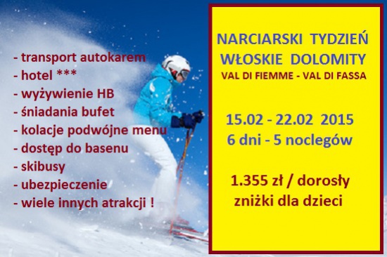 Stowarzyszenie SAWIR z Gniezna serdecznie zaprasza zainteresowane osoby na nasze wyjazdy narciarskie w Dolomity Włoskie. Koszty tygodniowego pobytu z dojazdem i wyżywieniem: 1499 zł od osoby dorosłej. Dzieci w pokoju z rodzicami - zniżki! Wszystkie szczegóły na stronie www.sawir.pl