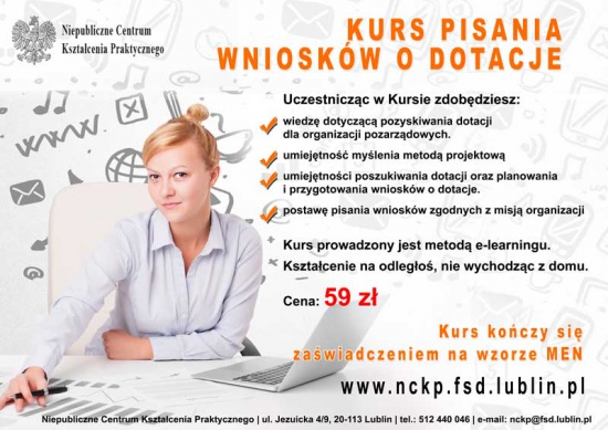 Więcej o kursie i zapisach na stronie: http://nckp.fsd.lublin.pl/index.php/248-kurs-pisania-wnioskow-o-dotacje-4