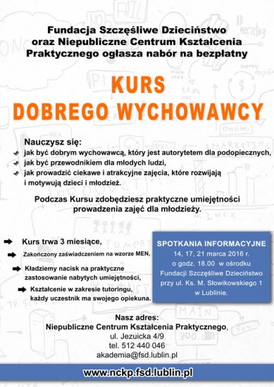 Fundacja Szczęśliwe Dzieciństwo zaprasza na Kurs Dobrego Wychowawcy skierowany do studentów wszystkich lat studiów zainteresowanych pracą z młodzieżą. Każdy uczestnik Kursu odbędzie trening zawodowy/praktyczny w Ośrodku Fundacji, dzięki któremu zdobędzie wiedzę i umiejętności potrzebne w pracy pedagoga, wychowawcy, instruktora grupy młodzieżowej, posługującego się takimi narzędziami wychowawczymi jak teatr i media.