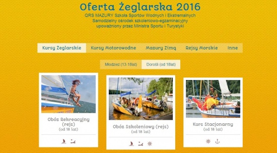 Zapraszamy dorosłych i młodzież na szkoleniowe rejsy po Mazurach - 2 tygodnie na wodzie dają dużo odpoczynku i umiejętności zdobytych podczas kursu na patent żeglarza jachtowego. Pływamy na wygodnych i bezpiecznych jachtach żaglowych poznając główną trasę Wielkich Jezior Mazurskich.
