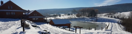Zakwaterowanie w drewnianych domkach z kominkami lub pokojach w pensjonacie, pełne wyżywienie i atrakcje.