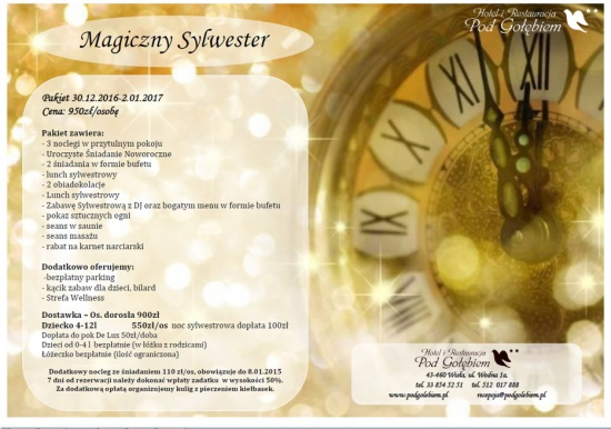 Sylwester to wyjątkowy czas - warto spędzić go z nami w Hotelu Pod Gołębiem**. Zabawa w górach razem z grupą przyjaciół lub z rodziną, to moc atrakcji i niezapomniane wrażenia. Zapraszamy zatem do malowniczej Wisły. Na ten wyjątkowy czas przygotowaliśmy dla Państwa specjalny pakiet pobytowy zawierający: