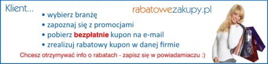 Rabatowe zakupy to atrakcyjne rabaty, zniżki, promocje, upusty, bonusy na zakupy i usługi w całej Polsce. Rabatowe zakupy to wyjątkowe oferty w niskich cenach z różnych branż, w tym także niedostępnych do tej pory w zakupach grupowych. Znajdziecie tutaj darmowe kupony na rabaty, promocje, upusty, oferty od firm z różnych branż i bogatym asortymentem. Dzięki rabatom, promocjom, upustom, bonusom, czy też ofertom specjalnym zamieszczanym przez firmy, możemy zaproponować bardzo atrakcyjne rabaty w formie darmowych kuponów rabatowych.