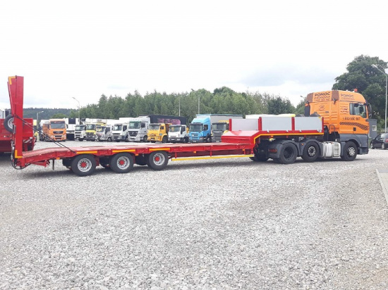 Ciągnik siodłowy trzy osiowy + nowa naczepa niskopodwoziowa trzy osiowa o ładowności 24t. Zestaw wyposażony w wyciągarkę hydrauliczną oraz najazdy hydraulicznie regulowane odnośnie rozstawu.