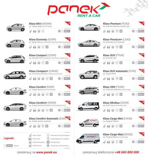 PANEK S.A. Wypożyczalnia Samochodów posiada w swojej ofercie ponad 600 aut, oraz 38 punkty wynajmu samochodów w całej Polsce, 12 oddziałów lotniskowych (Okęcie, Modlin, Wrocław, Gdańsk, Łódź, Lublin, Katowice, Kraków, Szczecin, Poznań, Bydgoszcz, Rzeszów).